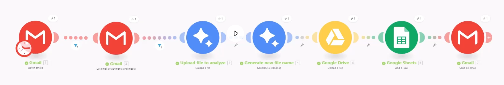 This automation watches incoming Gmail emails, detects attachments, uploads files for analysis, automatically generates structured file names, stores them in Google Drive, logs the details into Google Sheets, and optionally sends confirmation emails.