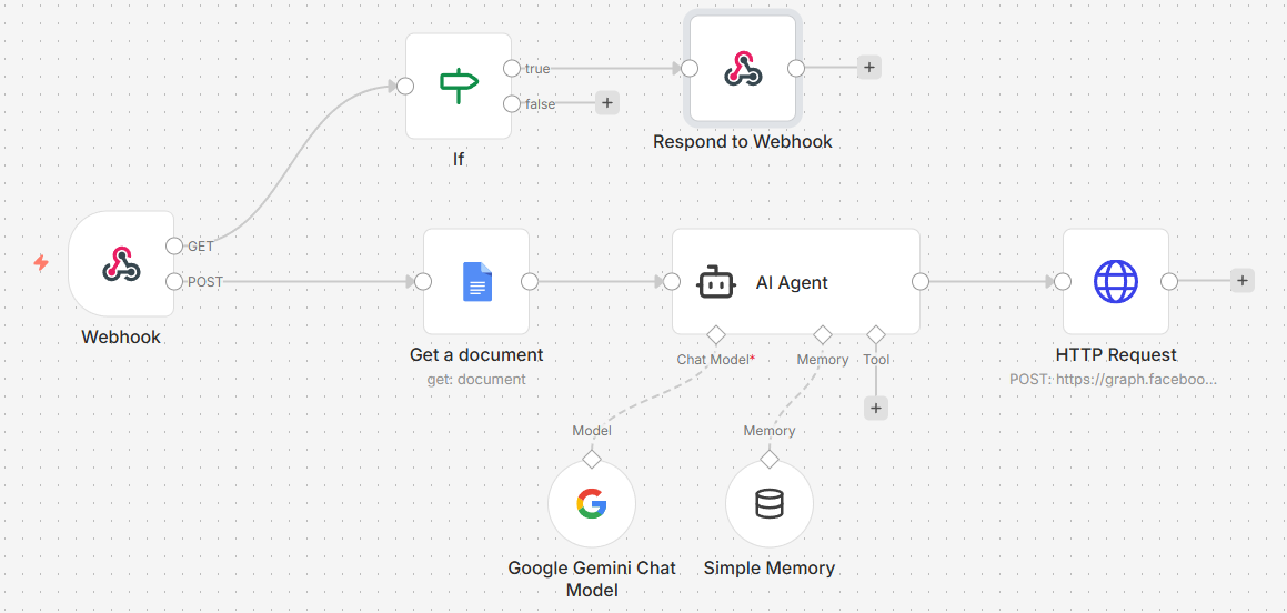 This workflow uses a webhook to receive incoming messages (e.g., from Facebook Messenger or a website form), pulls answers from a Google Docs knowledge base, processes the request through an AI Agent (Google Gemini), and sends a response back automatically via HTTP request (Facebook Graph API).