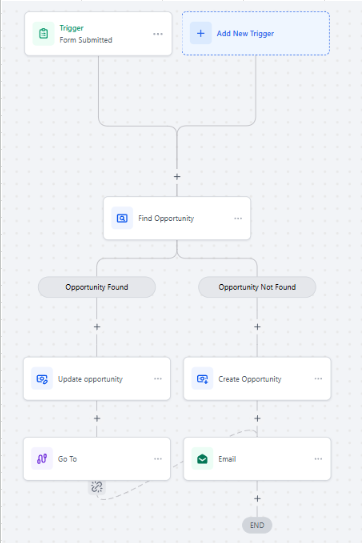 When a form is submitted, the system checks if an opportunity already exists. If found → it updates the opportunity. If not found → it creates a new opportunity and triggers follow-up actions like sending emails.